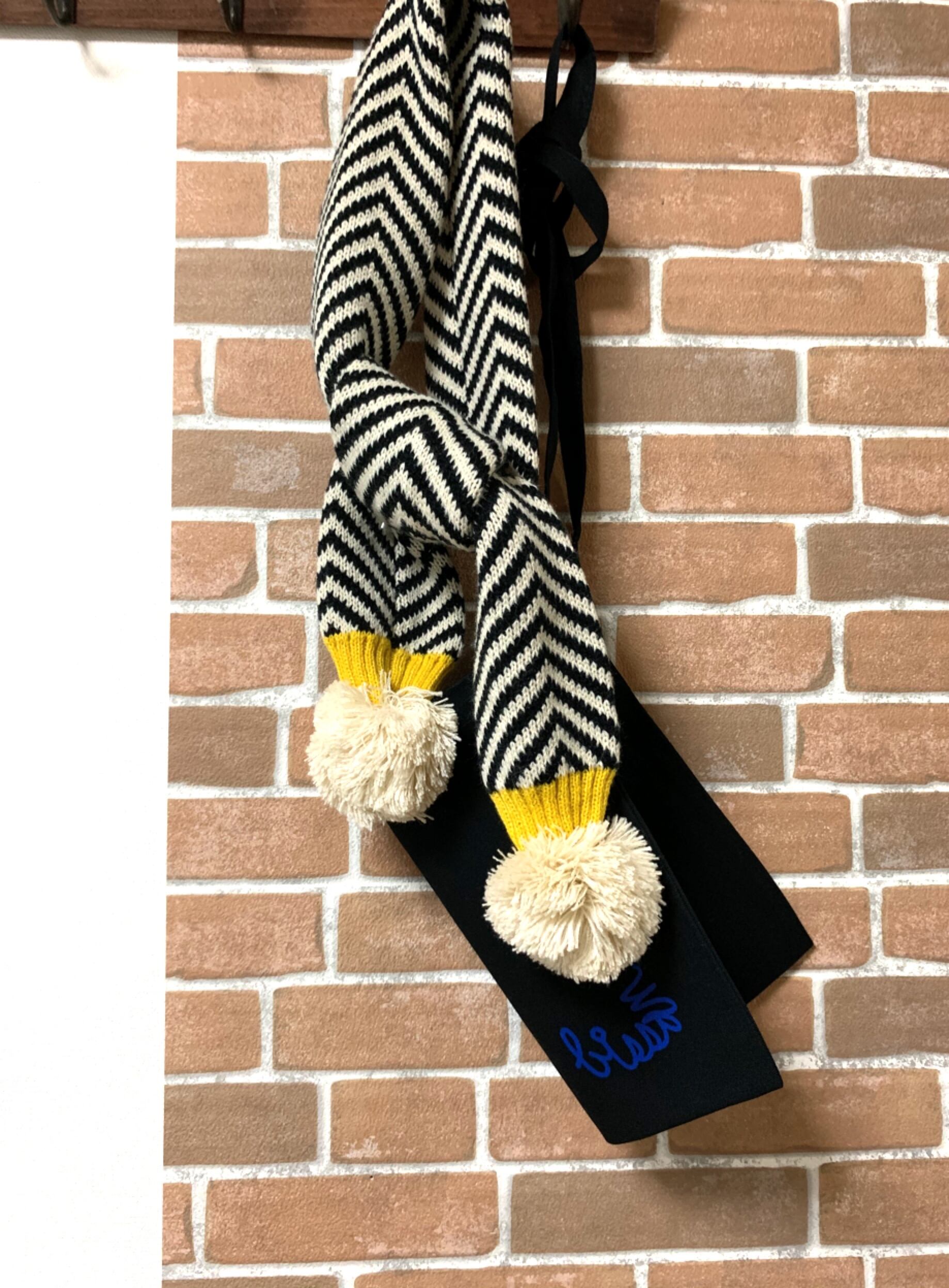 水色のライン、黄色のポンポンのマフラーには黒生地に水色のプリントのバッグがセットになっています。