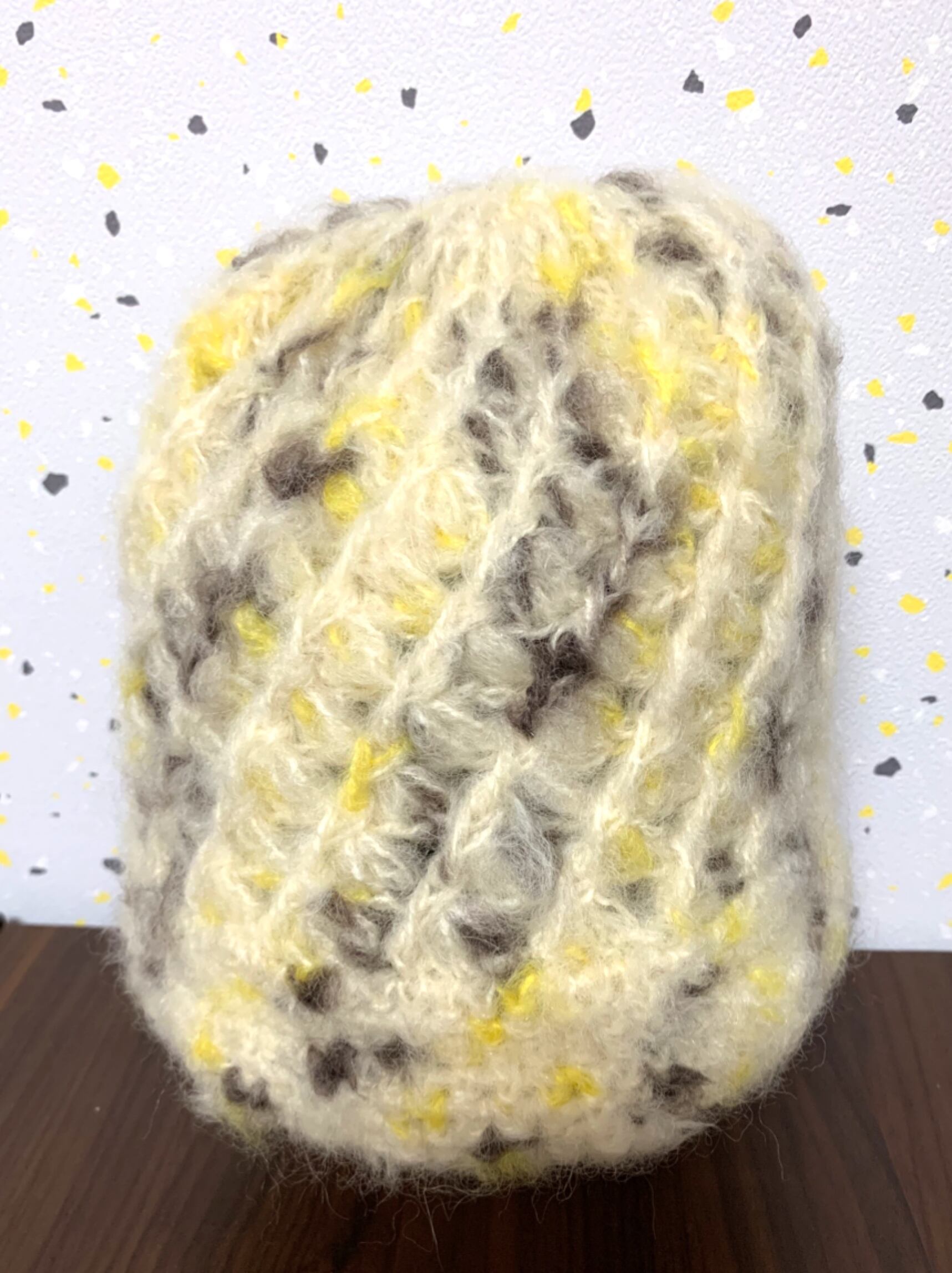 ホカホカのたまごふりかけおにぎりみたいにみえる帽子です。モヘアが入っていてすっぽりとかぶれて暖かいです。1つ1つ、まーくんのおばちゃんさんに編んでもらった貝殻みたいな模様が素敵なニット帽です。