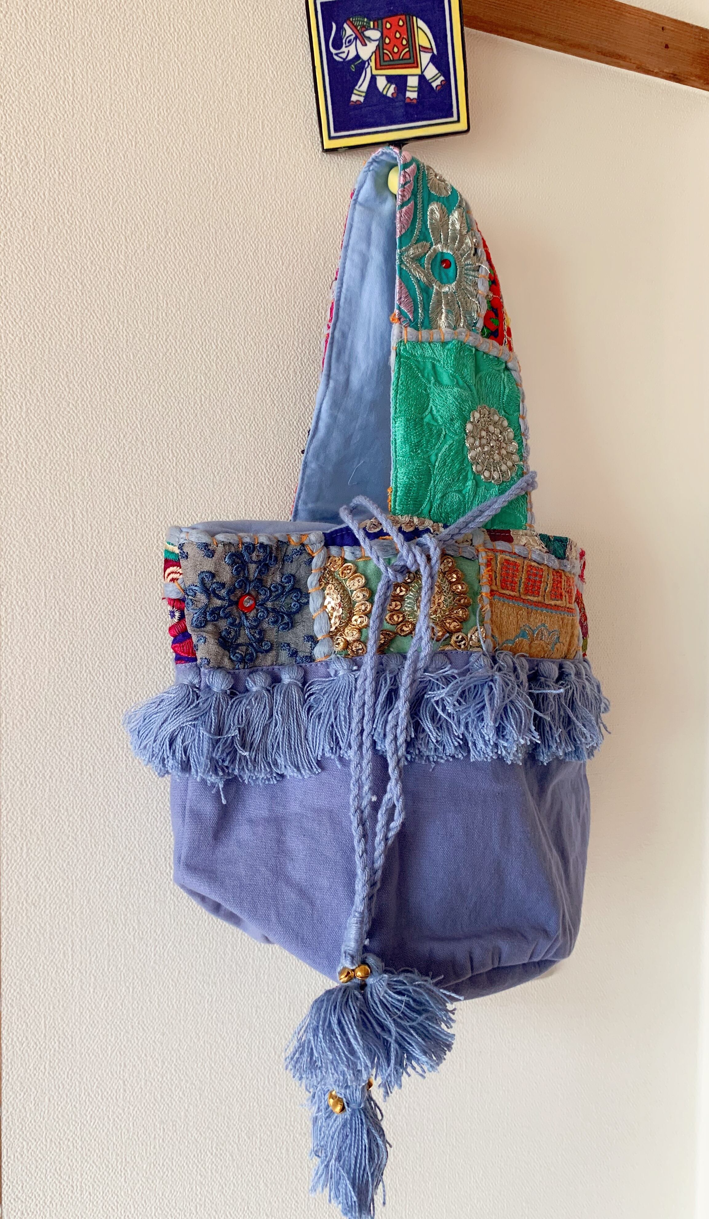 インドの古布にフリンジ、鈴などの装飾が素敵なバケツ型バッグです。
