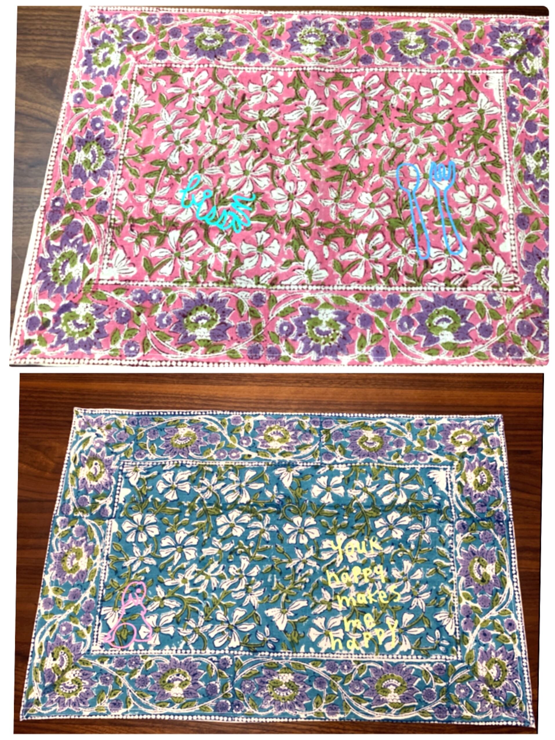 **ピンクとブルーのランチマット2枚のお届けになります。撮影に使った木のお皿や箸置き等の小物は付いていません。
