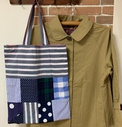 ベージュのコートにはブルー系の生地を合わせた縦型バッグがセットになっています。