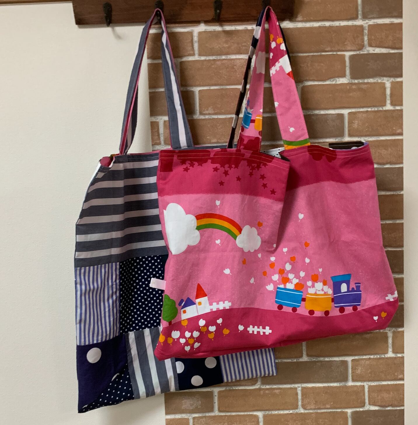 リバーシブルでお使いいただけるように、内側の生地はほっこり気分になりそうな電車柄を合わせてみました。