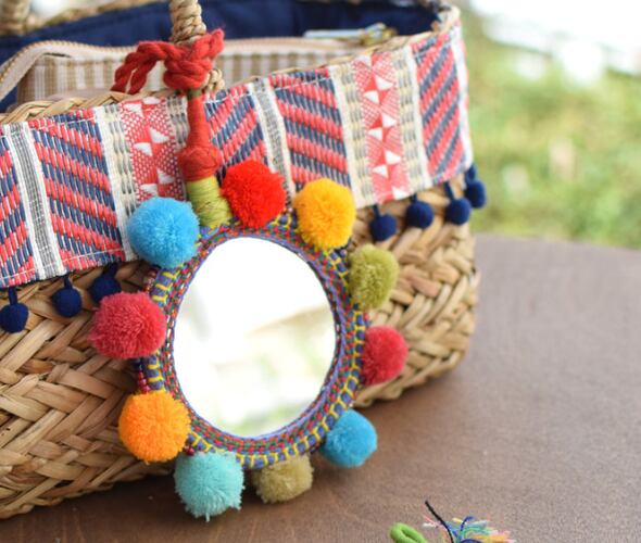 大きな鏡のまわりにカラフルなポンポンが飾られています。お持ちのキーリングやバッグに付けたり、お部屋や飾ったり、使い方は色々の可愛いミラーです。