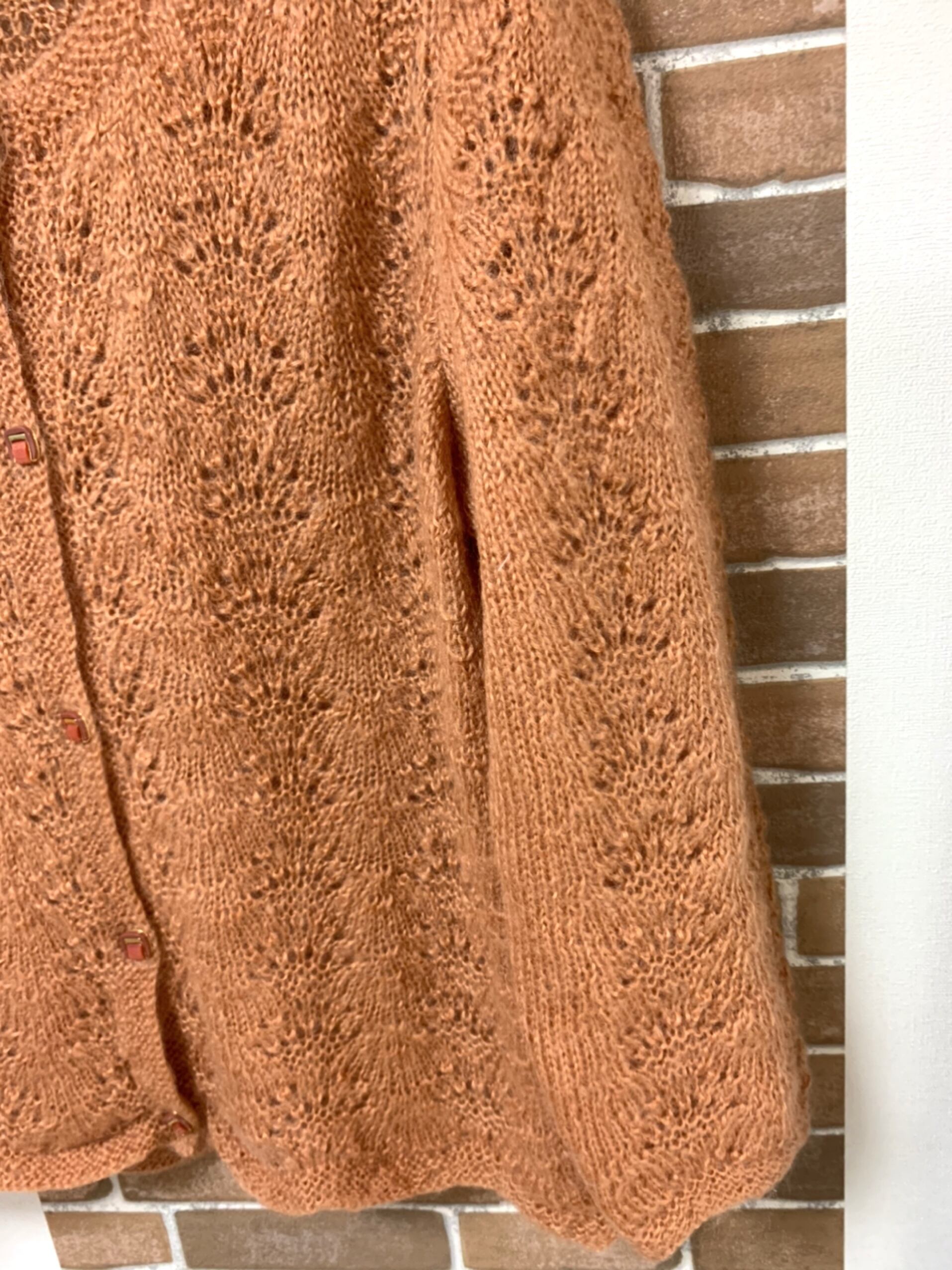 エッちゃんおばあちゃんの手編みのモヘアのカーディガンです。とても暖かいです。模様編みやボタンがどこか懐かしいレトロな感じでとても素敵です。
