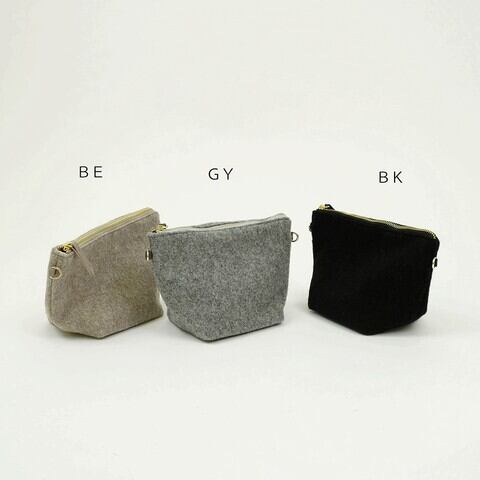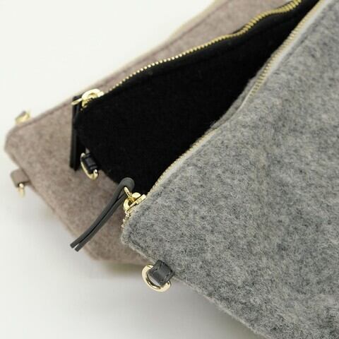 ウールの縮絨フェルトで出来た見た目から暖かな生地を使用し携帯や鍵・小さな財布程度が収納できる小さめのサイズです。ショルダーベルトは取り外しが可能で、ポーチやクラッチとしてもお使いいだけます。