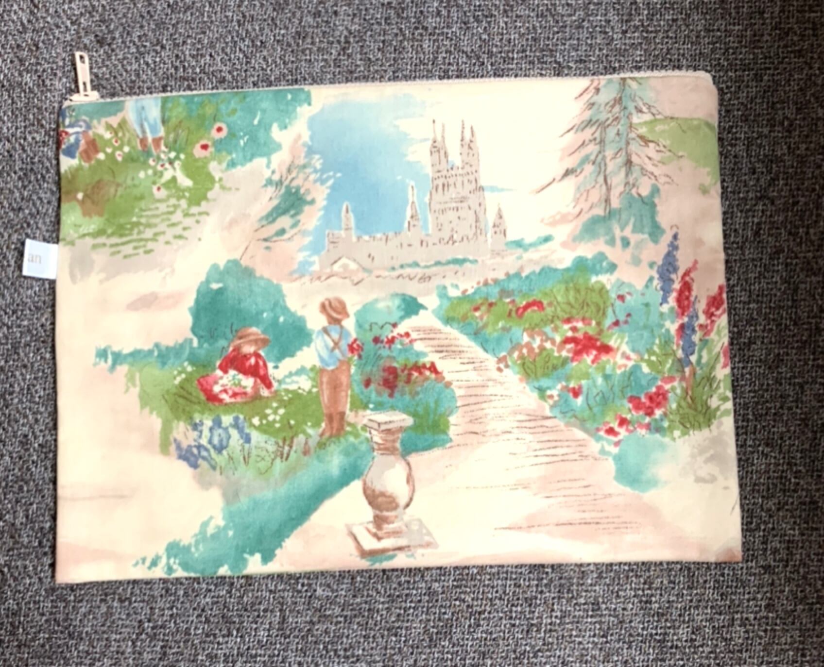 ビンテージの生地をを使っています。クラシックな雰囲気の絵がとても落ち着いた印象で