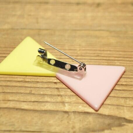 アクリル素材の三角モチーフのブローチはリボンみたいにもちょうちょみたいにも見えます。