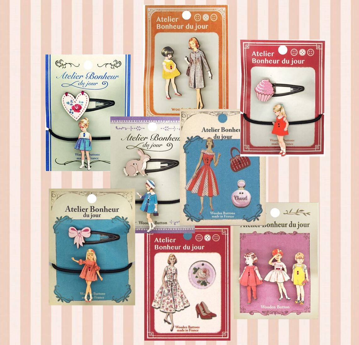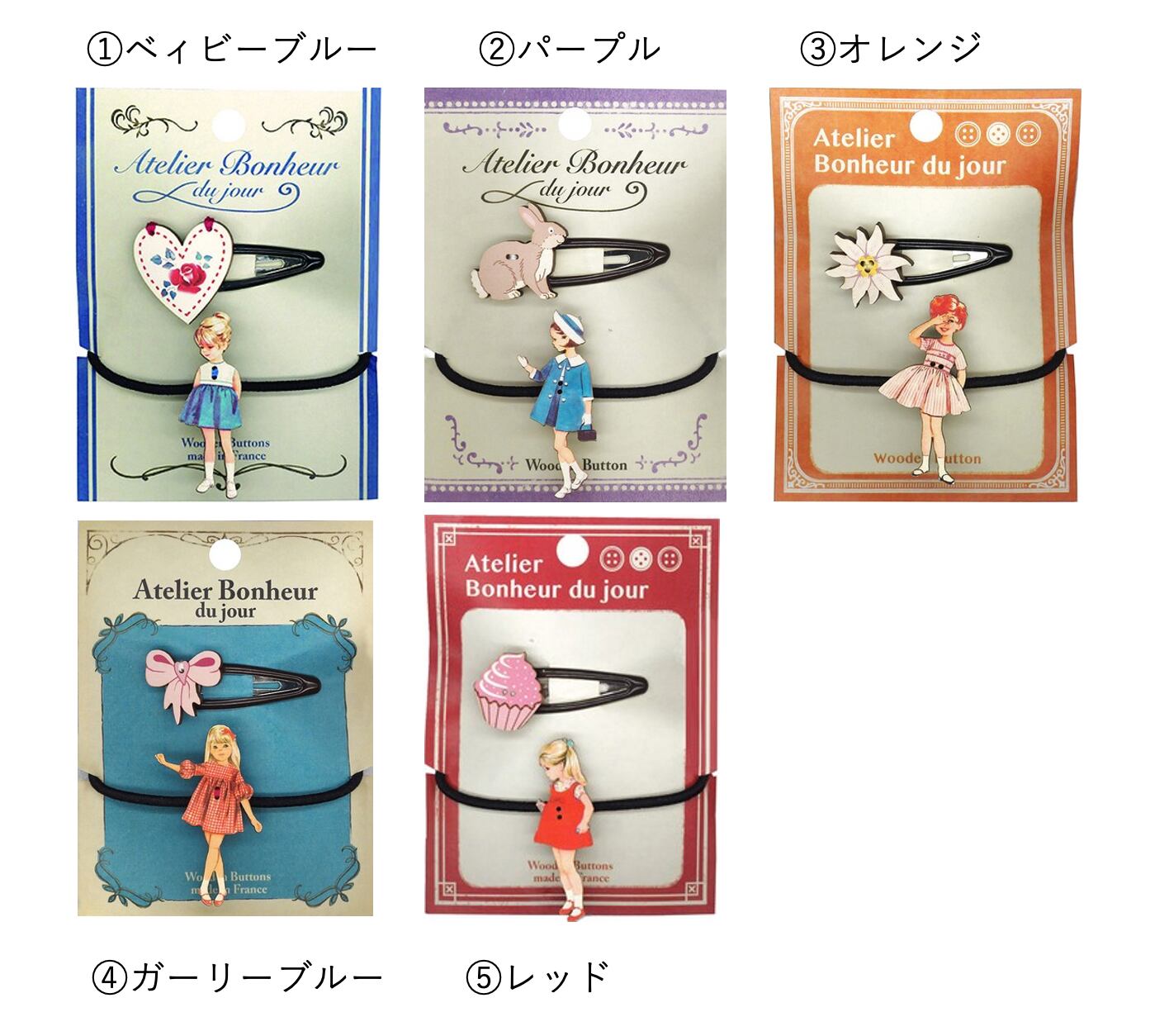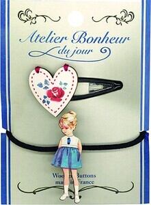フランスのリヨンで作られている「Atelier Bonheur du jour」の木製ボタンが可愛いヘアピン・ヘアゴムセットです。 台紙もアンティーク感が素敵なのでフレームに入れたりそのまま壁に貼ったり等等インテリアとして飾っていただくのも素敵かと思います。色々集めたくなるくらいどれも可愛いです。