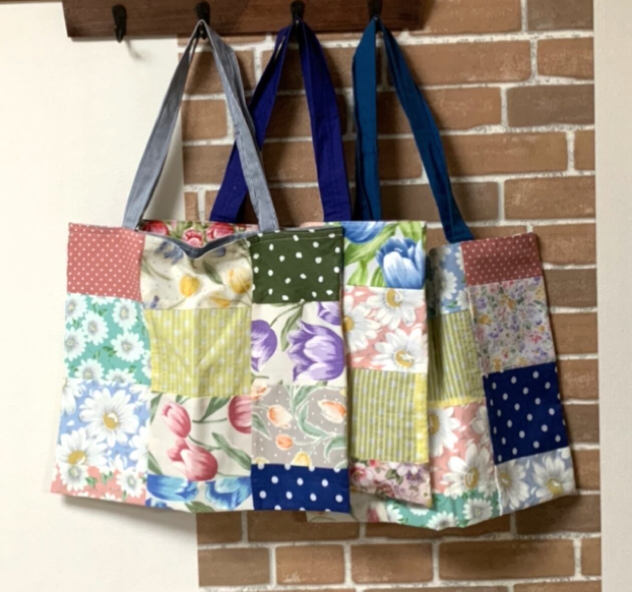 春色が素敵なパッチワークの袋バッグができました。春の花がついていてファンシーです。