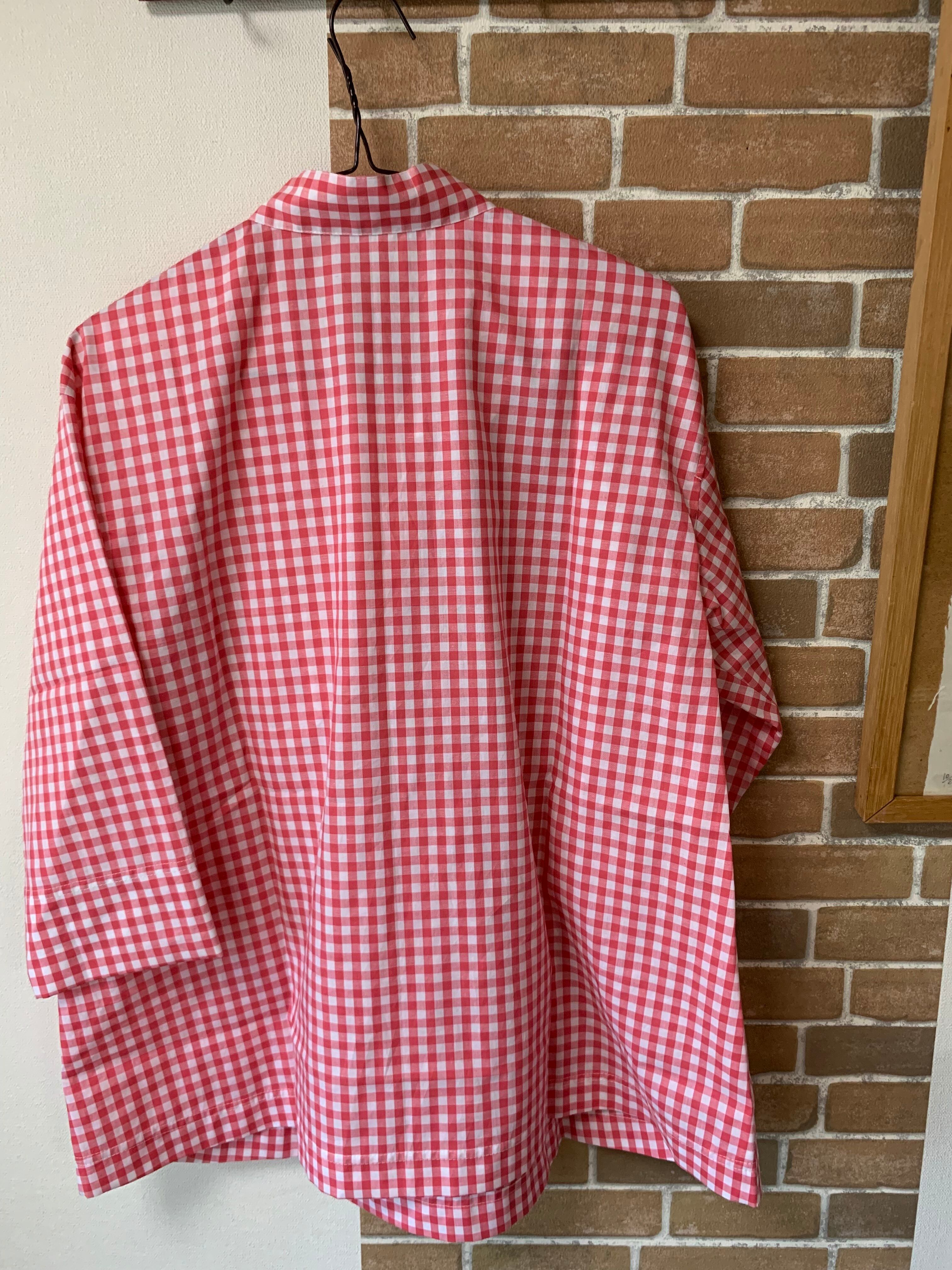 こちらのピンクのギンガムチェックは寒季節には黒や紺色、グレーやチョコ色のニットやカーディガンに合わせていただいても素敵だと思います。合わせる洋服のお色で甘くなりすぎずに着ていただける1枚です。