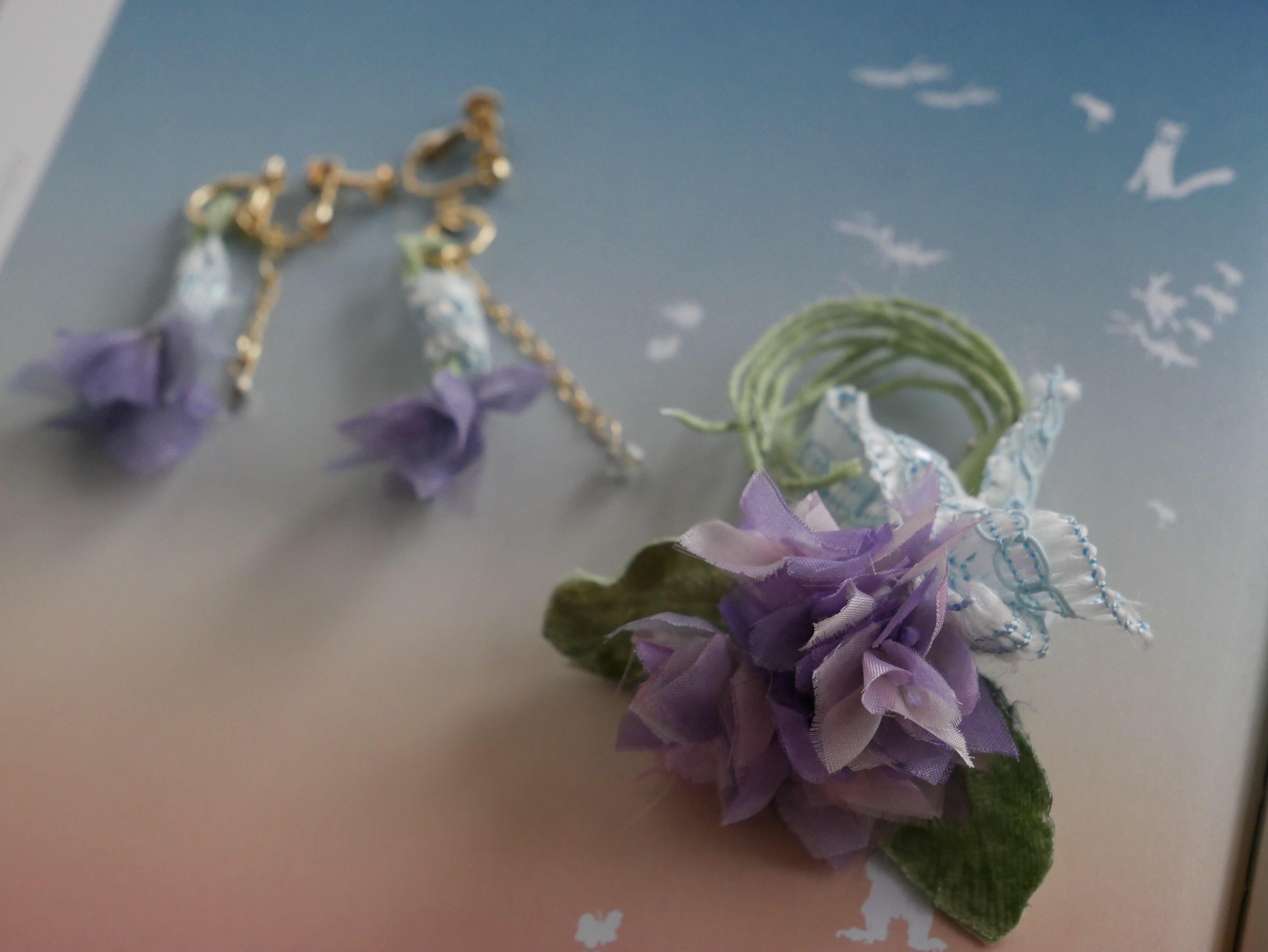 「moon+」さんの8月の新作ミニ紫陽花のコサージュとイヤリング(ピアス)です。