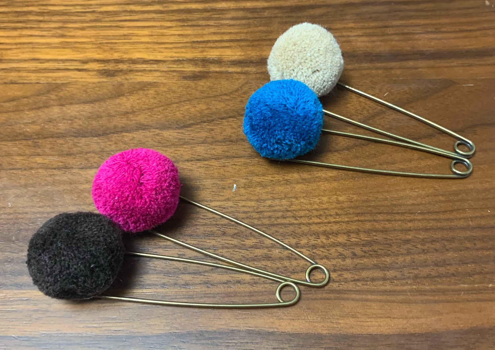ポンチョやショールの留め具に便利なカラフルボンボリのピンブローチのご紹介です。
