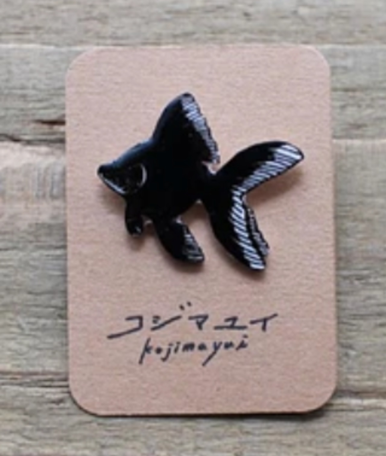 金魚のピンバッジのご紹介です。黒い金魚になんだかとても癒されそうです。
