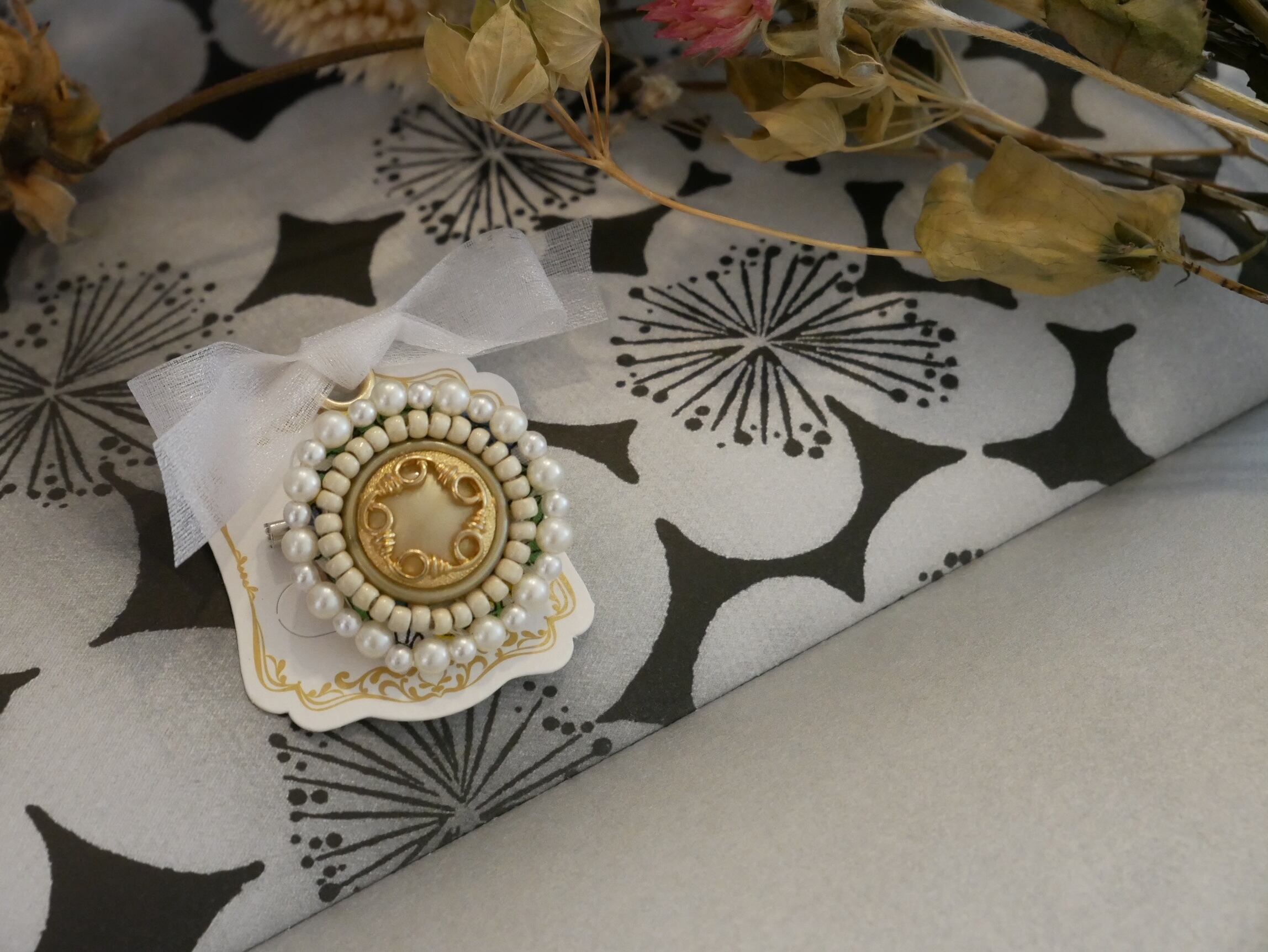 子供の頃からボタンやビーズを集めるのが好きでした。その中のボタンを真ん中に使用しています。まわりは小さなビーズで刺繍しています。これからの季節、ジャケットやコートなどにさりげなく使っていただけたら嬉しいです。