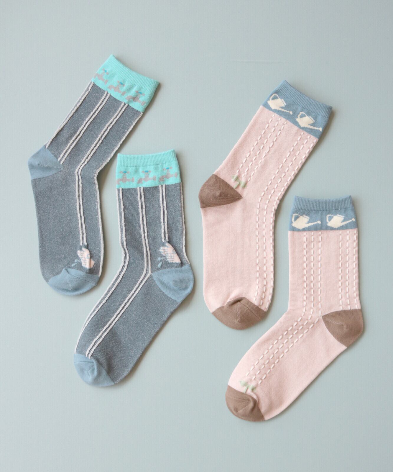 履き口に蛇口とじょうろの柄が入った個性的なソックスのご紹介です。