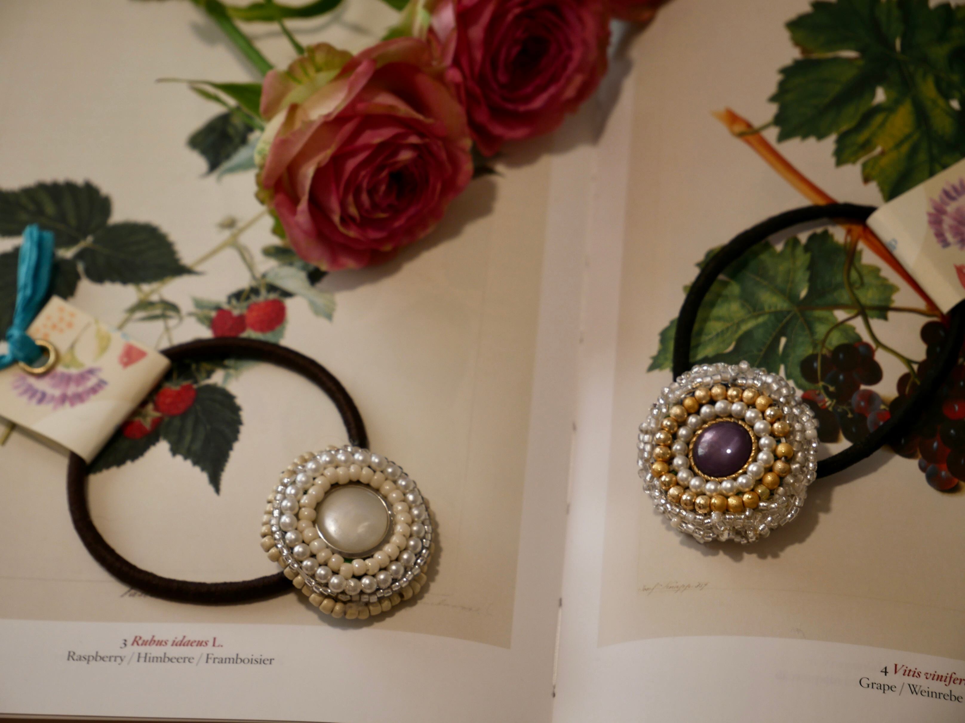 子供の頃からビーズやボタンが大好きです。そのコレクションのボタンを真ん中に周りは小さな小さなビーズで飾り付けをしました。季節を問わず使っていただけると思います。
