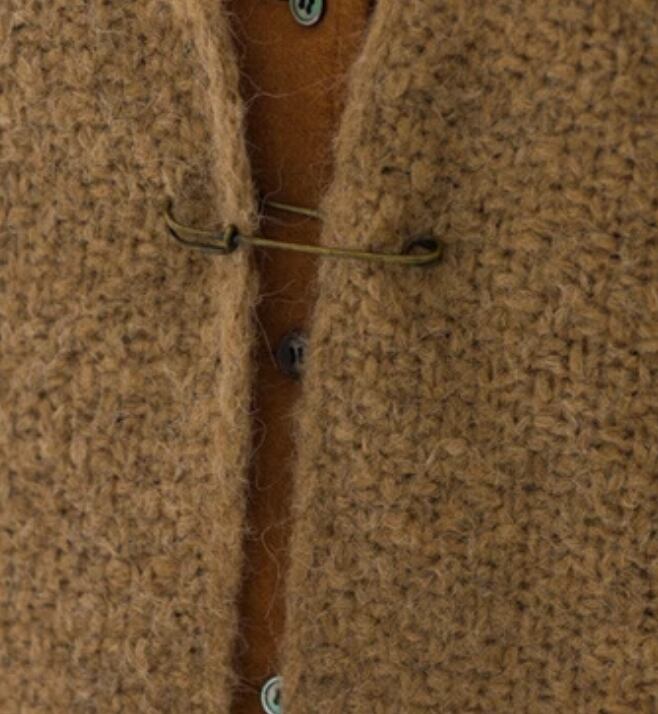 ボタンのないオープンフロントタイプです。付属として付いているピンで軽く前を止めるのも素敵です。肌寒い日にはお家の中でも重宝する1枚だと思います。