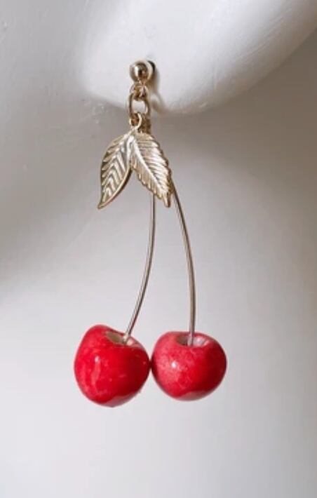 甘いさくらんぼが素敵なアクセサリーになりました。真っ赤なさくらんぼとさくらんぼの小さなピンクの花、片耳づつそれぞれ違います。ゆらゆらが素敵なさくらんぼです。