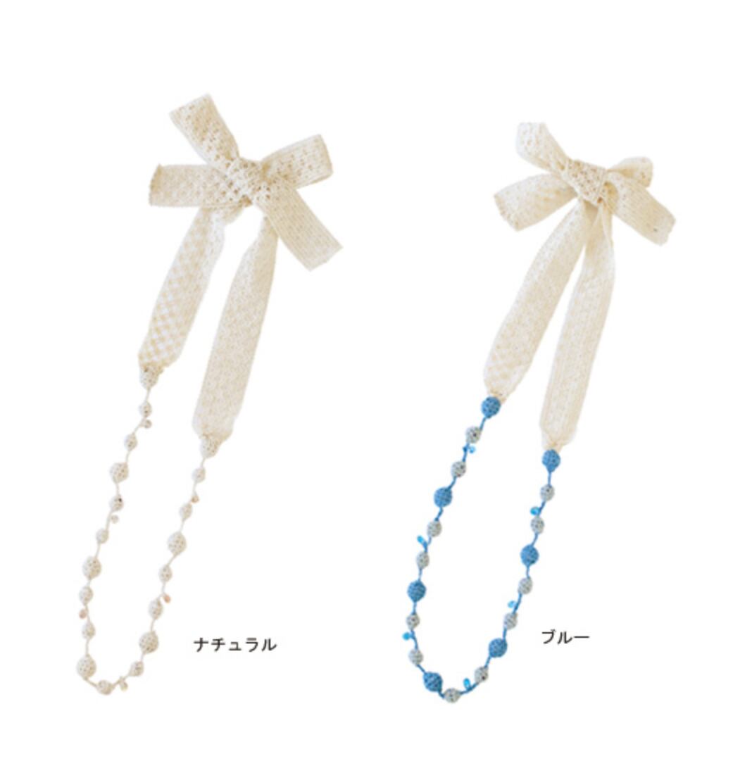 コットンとガラスビーズでできています。後ろの大きなリボンがアクセントになっていて素敵です。